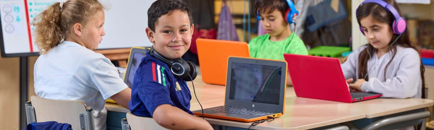 Vanaf groep 4 worden Chromebooks ingezet voor rekenen, taal en spelling. Na de basisinstructie werken leerlingen aan individuele leerdoelen. Als een opdracht goed wordt gemaakt, volgt automatisch een moeilijkere opdracht. Zo werkt ieder kind op zijn of haar eigen niveau en blijft de motivatie hoog.